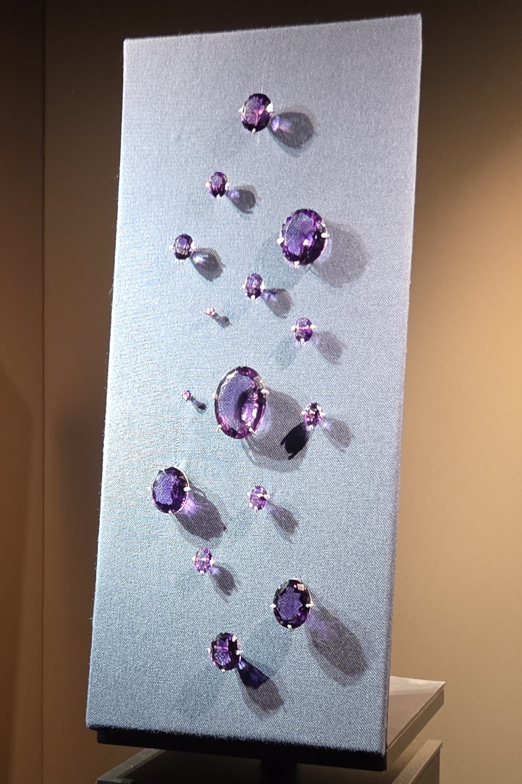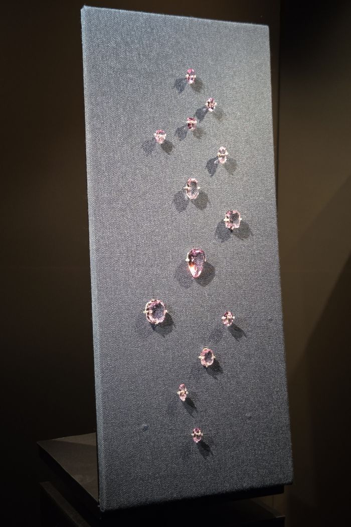 Des gemmes des Joyaux de la Couronne de l'École des Mines de Paris exposées à l'Hôtel de la Marine : à gauche, les topazes roses et à droite, des améthystes, toutes provenant de parures de l'Impératrice Marie-Louise.