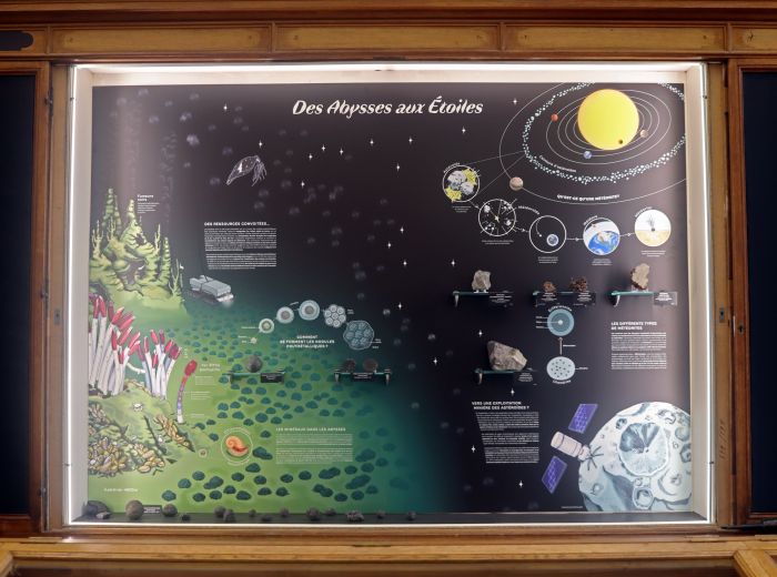 L'exposition capsule « Des abysses aux étoiles » reste encore quelques temps au musée ! Inaugurée dans le cadre du parcours « Des abysses aux étoiles », cette vitrine apporte des informations sur des objets des confins de notre planète et système solaire. Elle montre des météorites et des nodules polymétalliques et aborde les questions sur l’exploitation de ces rares ressources minérales des extrêmes. Le fond de vitrine, proposée par une jeune et talentueuse dessinatrice scientifique (Lola Lugand) ajoute une touche à la fois scientifique et artistique qui anime la Salle K du musée. Venez découvrir et en apprendre un peu plus sur les enjeux de potentielle exploitation minérale de ces types d'échantillons qui nous amènent aux confins de notre système solaire et au plus profond des océans. |