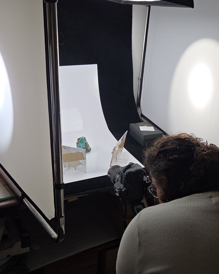En 2025, la collection du musée s'est encore agrandie. Pendant les dernières semaines avant la fermeture de fin d'année, Romain s'est attelé à photographier les nouveaux échantillons acquis. Mais la tâche n'est pas facile : la photographie de minéraux demande un savoir-faire unique, pour donner à la fois un bon rendu esthétique tout en montrant les caractéristiques qui rendent le minéral unique et reconnaissable. Ces photographies sont associées à chaque nouveau minéral dans notre base de données et font parties de la fiche d'identité de l'échantillon.