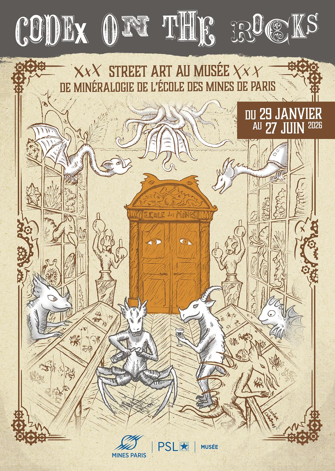 Réunir l’esprit sauvage et éphémère de l’art urbain, les chimères vandales d’un artiste interlope, la beauté éternelle du monde minéral et la renommée internationale d’une institution prestigieuse ? C’est le pari étonnant de cette nouvelle exposition du Street Artist Codex Urbanus au sein de la très vénérable École des Mines de Paris (Mines Paris – PSL), offrant un cocktail étincelant dont les deux principaux ingrédients sont une collection exceptionnelle de milliers de minéraux et quelques bombes aérosol, mixées au shaker artistique et présentées dans un splendide cadre victorien. Venez vous perdre dans les vitrines, découvrir un parcours de visite parallèle et vous laissez surprendre par cette rencontre inattendue entre l’art, le fantastique et le monde minéral.