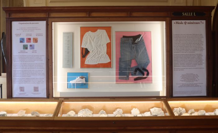 Vitrine "Mode & Minéraux ?" servant de support au parcours éponyme, créée par les chercheurs de la Chaire Mode & Textile de PSL.
