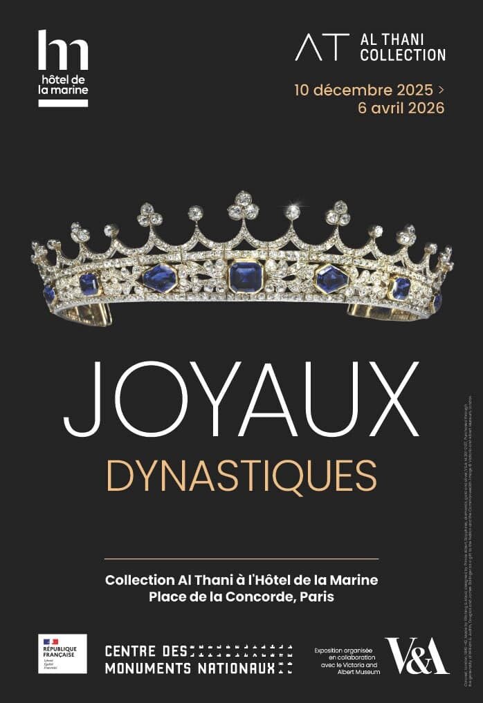 Du 10 décembre 2025 au 6 avril 2026, la Collection Al Thani à l’Hôtel de la Marine, à Paris, présente, troisième volet d’une trilogie d’expositions organisée en collaboration avec le Victoria and Albert Museum. Cette exposition réunit des joyaux rares, historiques et d’une importance majeure provenant à la fois des collections du prestigieux musée londonien le V&A et de la Collection Al Thani, dont beaucoup sont exposés en France pour la première fois. Le bijou, expression intemporelle de pouvoir et de prestige, se révèle ici aussi comme un objet intime, porteur de sentiments et messager de faveurs royales. L’exposition rassemble des joyaux associés au règne de figures emblématiques de l’histoire européenne telles que les impératrices Catherine II de Russie, Joséphine, Marie-Louise d’Autriche, et la reine Victoria. Pierres de légende, diadèmes somptueux, broches éblouissantes et colliers d’apparat composent un langage fastueux, celui des cours royales, où chaque gemme révèle le statut, la lignée et l’autorité de son illustre détenteur.