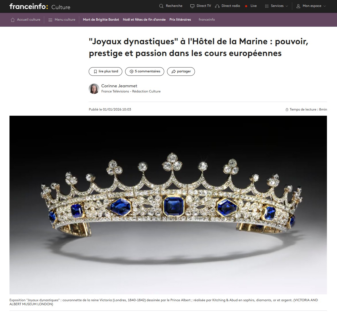 " "Joyaux dynastiques" à l'Hôtel de la Marine : pouvoir, prestige et passion dans les cours européennes" publié par FranceInfo Culture.