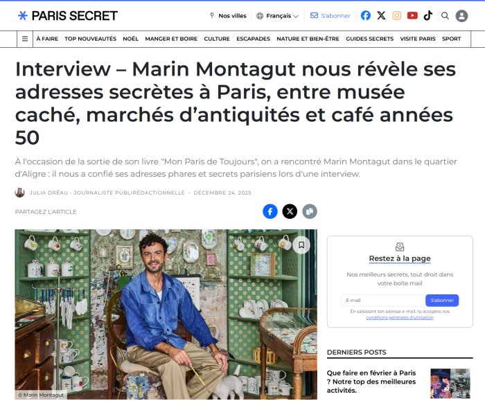 "Interview – Marin Montagut nous révèle ses adresses secrètes à Paris, entre musée caché, marchés d’antiquités et café années 50" publié par Paris Secret.