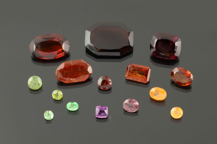 Une sélection d'une variété des grenats gemmes. Crédit photo : Musée de Minéralogie Mines Paris - PSL / Éloïse Gaillou.