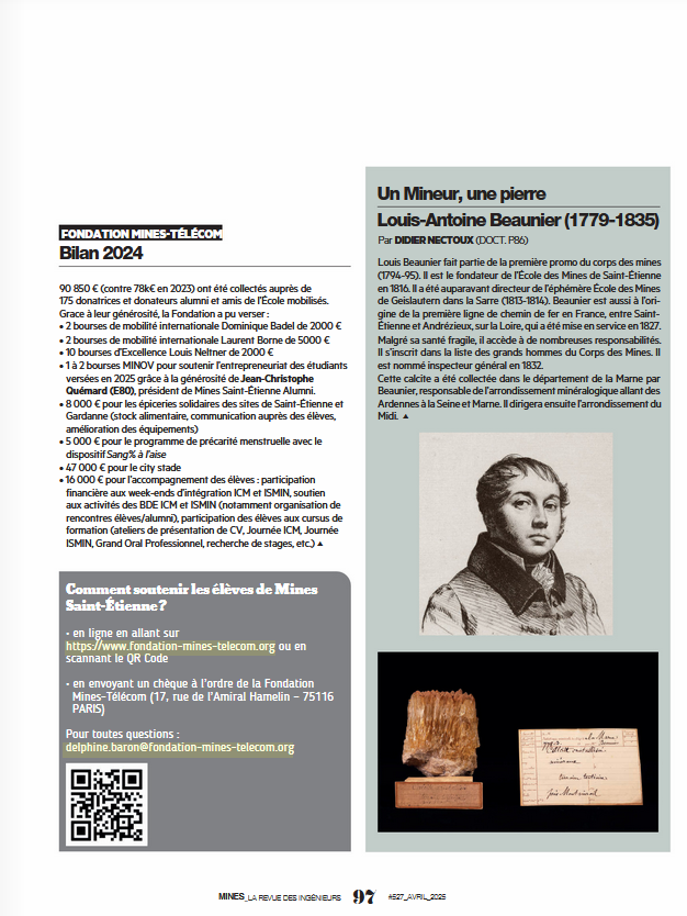 En page 97, vous pourrez également découvrir la rubrique "Un Mineur, une pierre" écrite par l'ancien directeur du musée Didier Nectoux. Cette anecdote permet de découvrir le fondateur de l'École des Mines de Saint-Etienne, Louis-Antoine Beaunier et une calcite conservée au Musée collectée par Beaunier dans la Marne.
