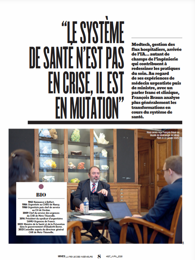 Vous pourrez retrouver dans le dernier numéro de la Revue des Mines d'avril 2025, portant sur l'ingénierie médicale (pages 8-13), l'interview de François Braun ancien ministre de la santé. L'entretien a été réalisé au Musée par Marie-Pauline Talabard, Alumni de la promotion 2010 de L'École des Mines de Saint Etienne, et Marin Boyet, Alumni de la promotion 2014 de Mines Paris - PSL.