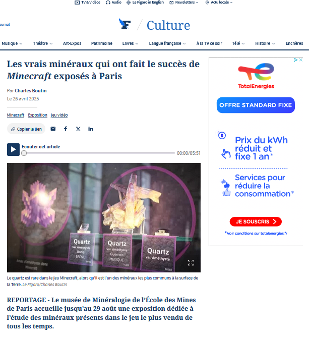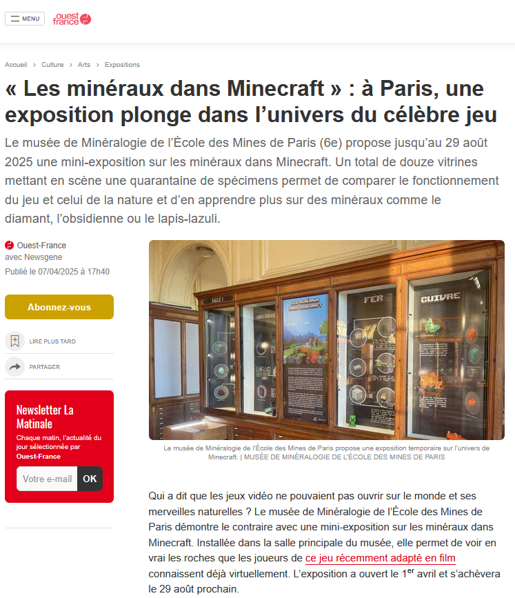 Vous pouvez retrouver la nouvelle mini-exposition du musée "Les Minéraux dans Minecraft" dans une sélection d'articles parus récemment : - Dans l'article "Les Minéraux dans Minecraft : à Paris, une exposition plonge dans l'univers du célèbre jeu" publié le 7 avril 2025 sur le site du journal Ouest France. - Et dans "Les vrais minéraux qui ont fait le succès de Minecraft exposés à Paris" publié le 26 avril 2025 sur le site du Figaro et écrit par Charles Boutin. Nous les remercions chaleureusement pour ces articles !