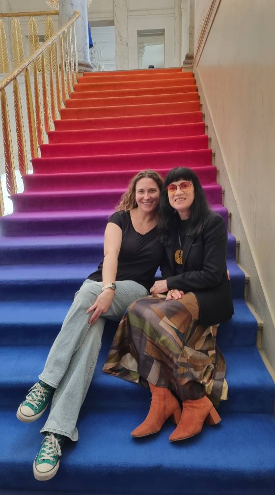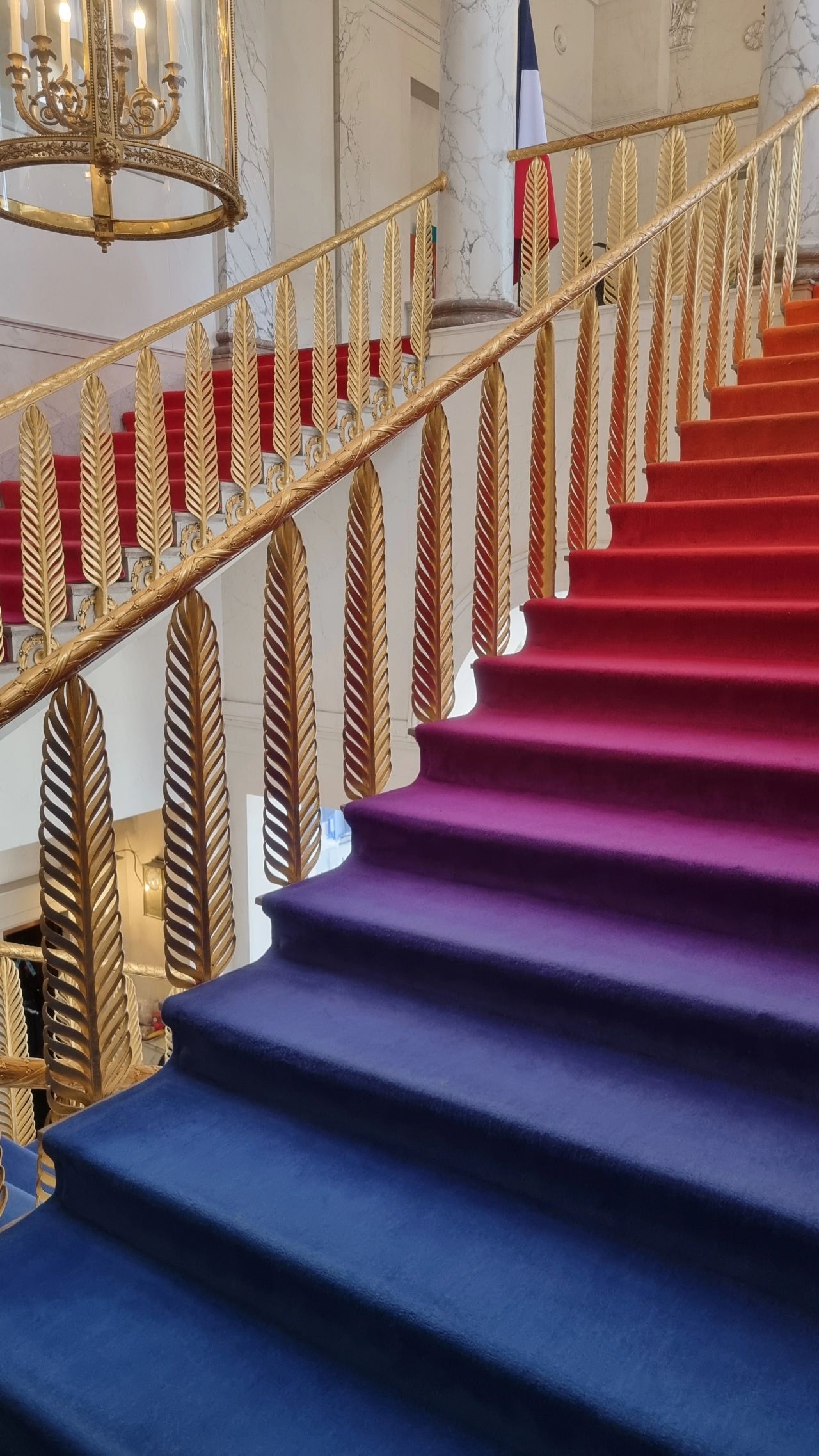 Éloïse a été invitée par l'artiste Nathalie Junod Ponsard à découvrir ses oeuvres-tapis au palais de l'Élysée le samedi 26 avril dernier. Cette artiste a été commanditée par le Mobilier National pour réaliser ces différentes oeuvres-tapis pour le palais de l'Élysée. L'oeuvre la plus spectaculaire par son envergure est "Odysée" recouvrant l'escalier Murat.