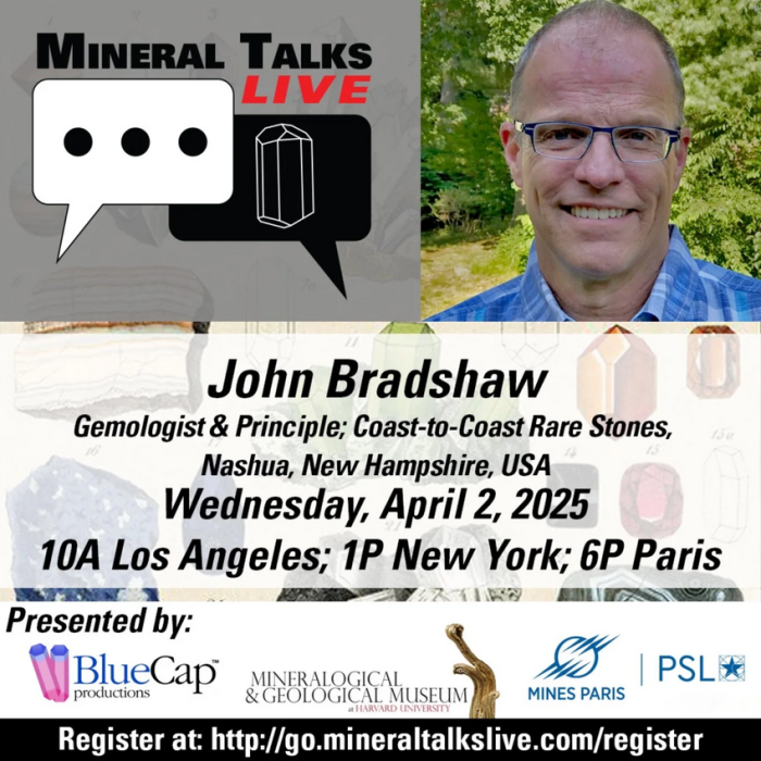 Mercredi 7 mai 2025 à 19h a lieu le nouveau Mineral Talks LIVE présenté par Éloïse, Bryan Swoboda (Blue Cap Production) et Raquel Alonso-Perez (Mineralogical & Geological Museum, Harvard University) avec comme invité Dave Bunk.