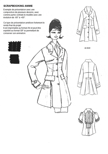 This type of presentation has the originality of being new, it clearly improves the final rendering of a fashion project. It can be printed in A4 format and sent by Mail as a GIF, allowing it to retain its animation. (Voir grand format)