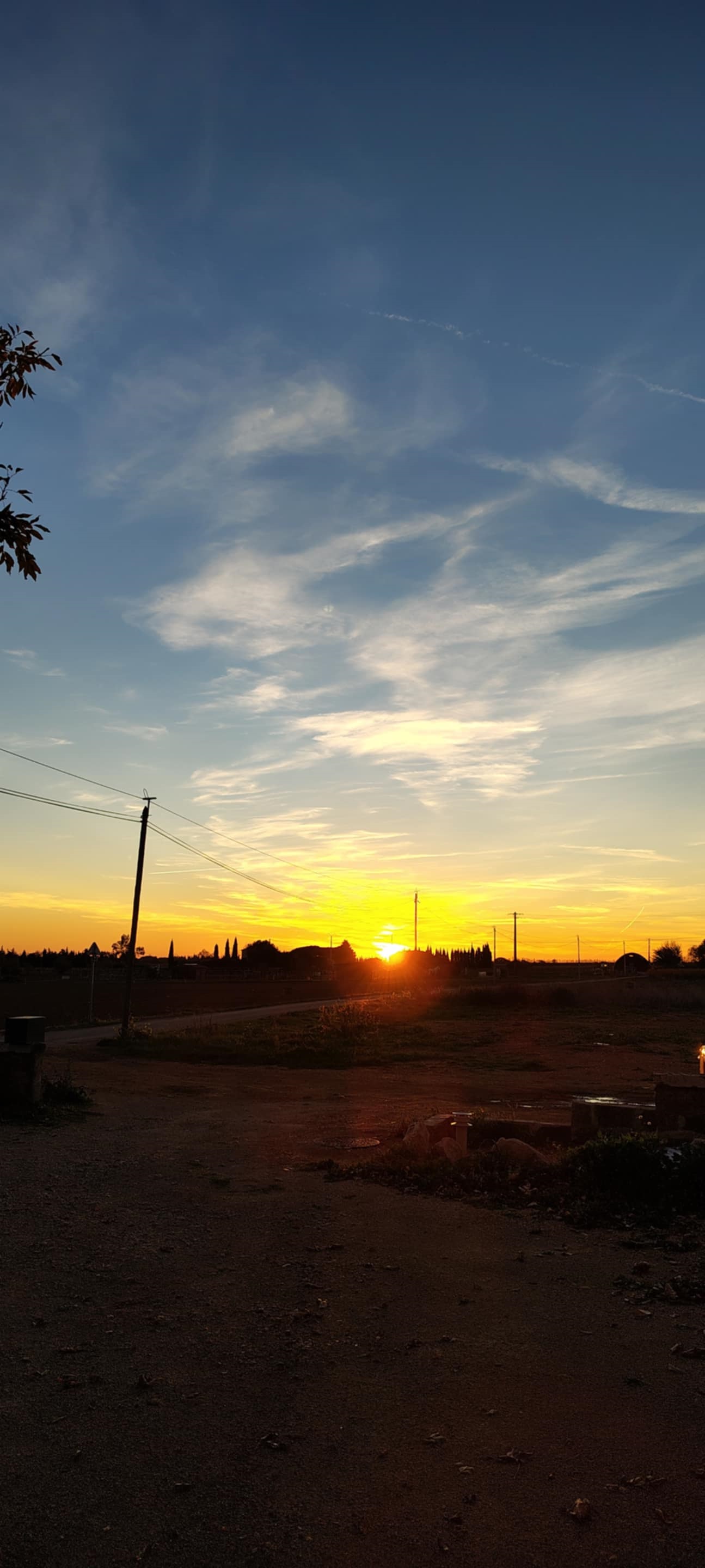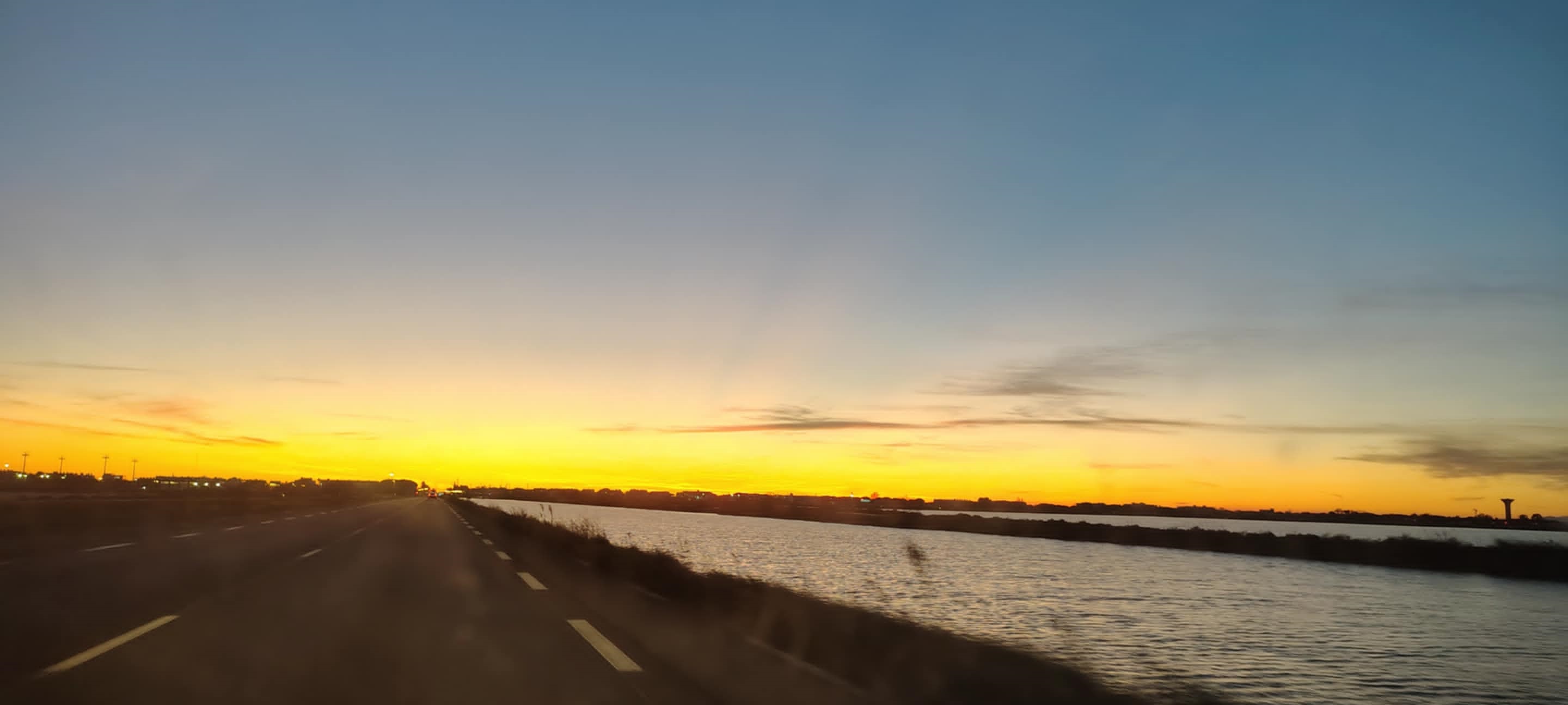 (Le même coucher soleil, un court moment plus tard, en balade en bagnole)