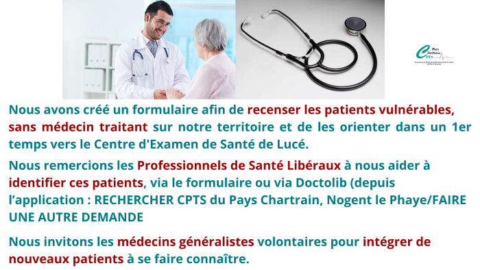 Chaque patient sans médecin traitant, se verra proposer par la CPTS, un pré bilan au Centre Examen de Santé de Lucé avec le Dr Dîna, afin de faciliter la 1ère consultation.