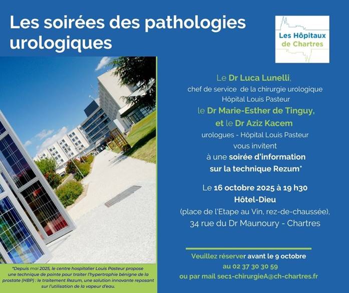 Première soirée des pathologies urologiques, consacrée à la technique du Rezum. A cette occasion, seront également abordées les techniques de la neuromodulation et de l’électroporation. Jeudi 16 octobre à 19h30, à l’Hôtel-Dieu – Chartres