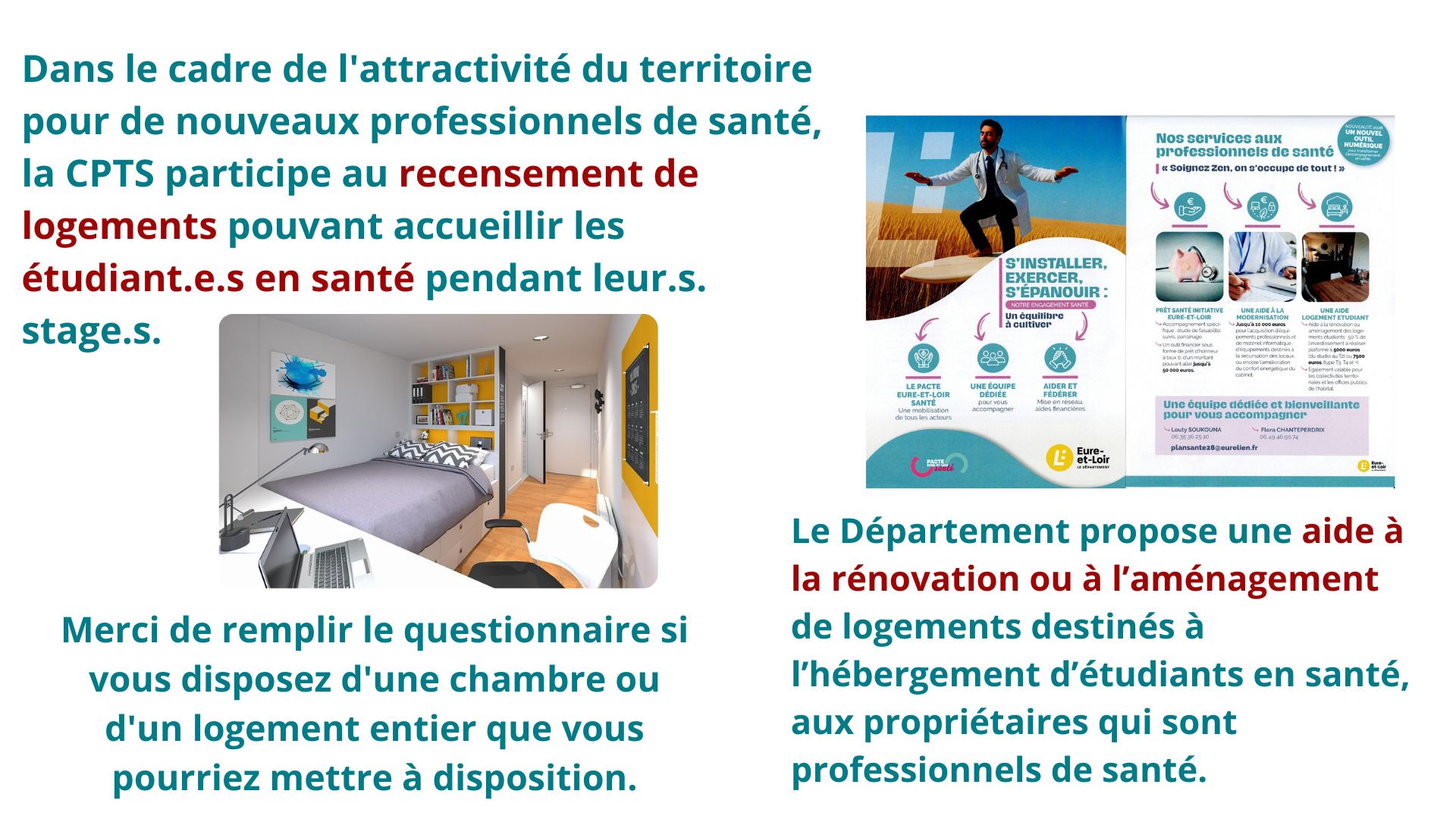 La CPTS, en partenariat avec le Département, les Communautés d’Agglomération et les mairies, met en place des outils afin de faciliter l’installation de nouveaux professionnels de santé et la venue de stagiaires : accueil par une prise de contact et recensement des logements disponibles pour les étudiants.
