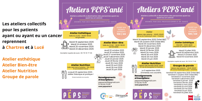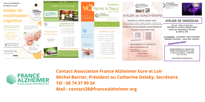 Les activités proposées par France Alzheimer reprennent dès septembre à Chartres. -Atelier de Relaxation, réservé aux Aidants, dès le mercredi 3 septembre -Atelier de Snoezelen, réservé au couple aidant/aidé, dès le mardi 9 septembre -Atelier de sonothérapie, réservé au couple aidant/aidé, dès le mardi 23 septembre -Atelier de Mobilisation Cognitive (animé par une Neuropsychologue), réservé aux Malades, dès le vendredi 5 septembre -Groupe de Parole (animé par une psychologue), réservé aux Aidants (possibilité de prendre en charge les aidés) dès le jeudi 11 septembre